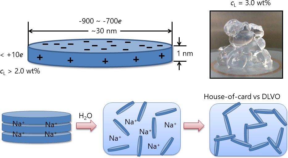 The synthetic clay particles are non-spherical and asymmetrically charged, which is complicated to describe and simulate. We found that the gelation kinetics, which is sensitive to particle interaction potential, can be predicted precisely enough by approximating the particle as negatively charged spheres, but the counterions condensation due to the high surface charge density must be taken into account.[1][2]
