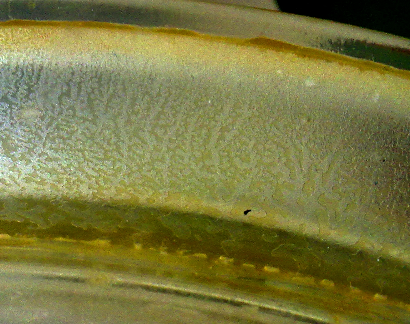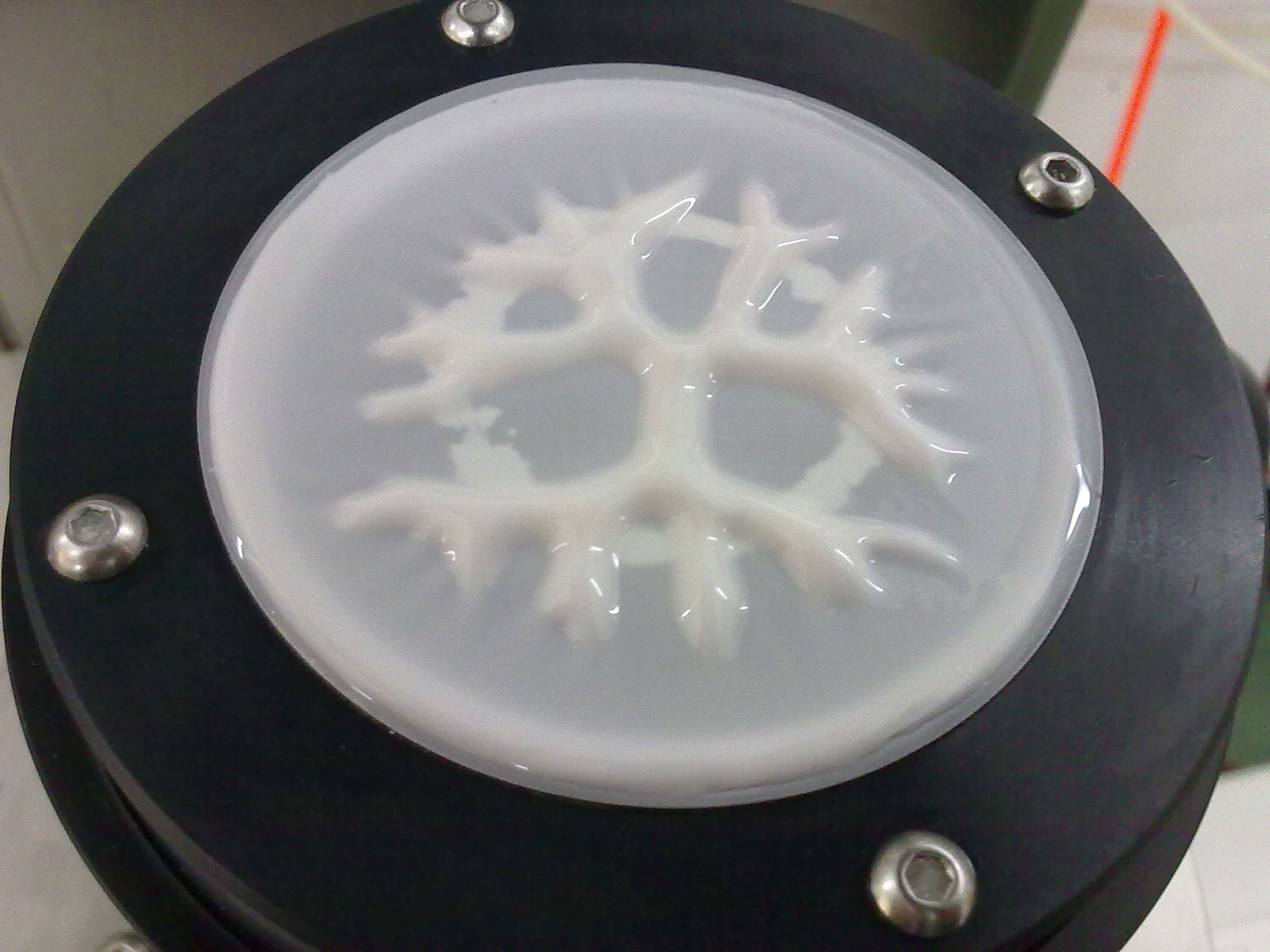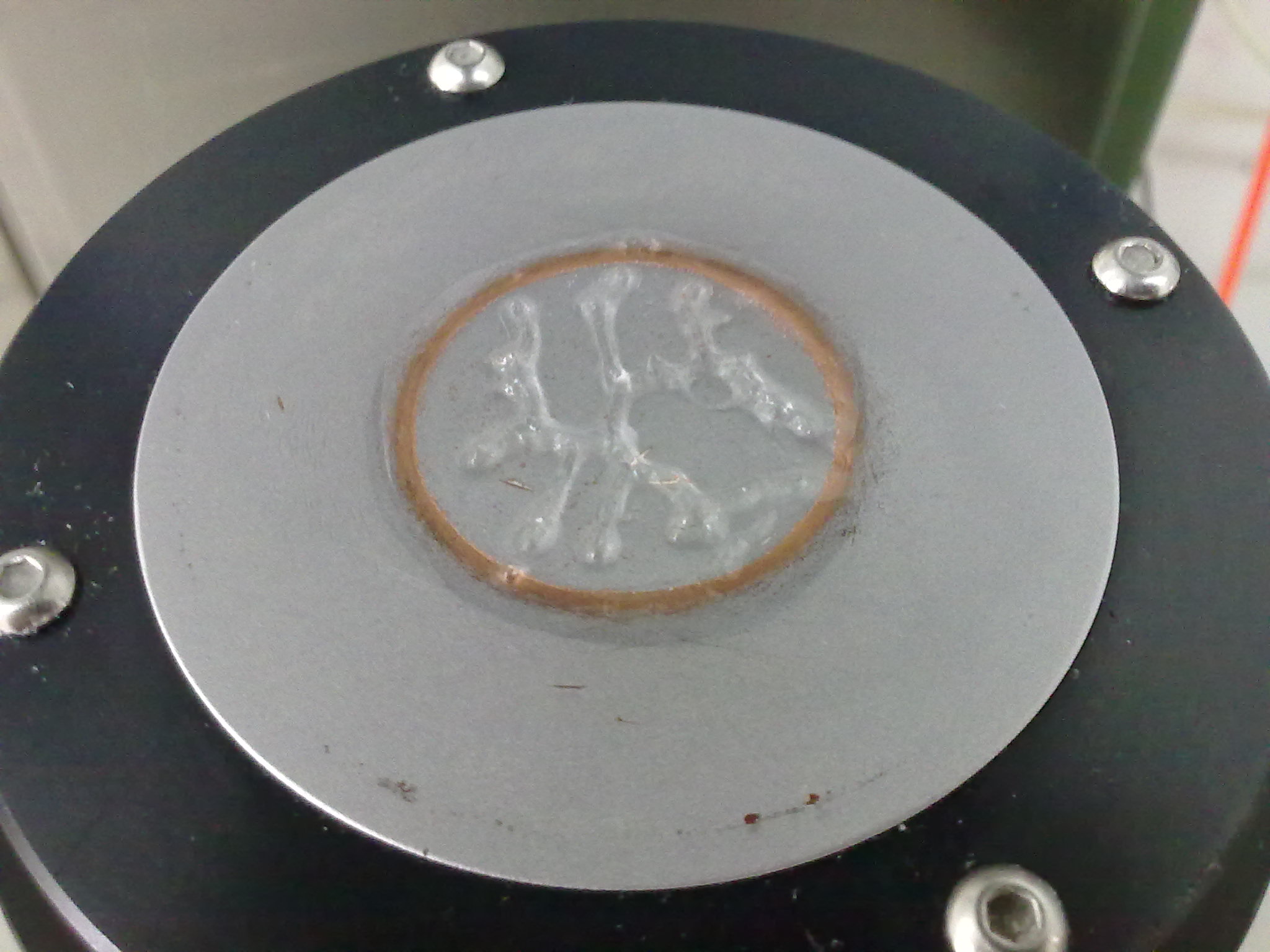 这是由于夹具升起时,平板或锥板之间在初始的一瞬间相当于向厚度很小的已测样品快速注入空气(一种流体)而产生Saffman-Taylor不稳定性。除了在流变仪上可以观察到这一现象外,在真空干燥器放气的时候,也能看到这种不稳定性。真空干燥器的边缘密封处之间涂有真空脂。抽真空的时候,外界的大气压把干燥器的盖子压得很严,因此密封处紧密贴合;放气的时候,外界大气压的力被内部不断回复的气压抵消,干燥器盖子就松了,密封处漏气,就相当于一个Hele-Shaw实验,因此产生了Saffman-Taylor不稳定性: