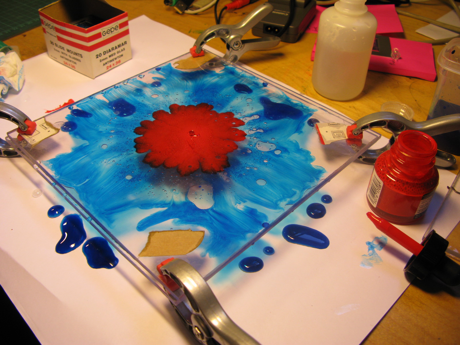 Hele-Shaw Cell是间距非常小的两块平板。快速注入一种流体,流体就会在平板间形成流体不稳定性的图案(称为finger)。这种不稳定性称为Saffman-Taylor instability(Proc. R. Soc. London, Ser. A 1958, 245, 312)。