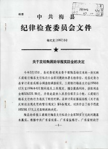 二、依法追究有关责任单位有关责任人员的法律责任。根据字斟句酌修改了三四遍的、删改添加处竟有30多处的、正文不足400字的、现已成了其枉纪枉法铁证的中共梅县纪委梅纪发[1997]8号文和国家财政部、审计署、中国人民银行财监字[1995]29号文等各级有关部门清查处理小金库的5份文件(小金库已导致举报有功人跳楼自杀身亡,其行为性质还不属于“情节严重”、“触犯刑律”呀?)及当时市纪委信访室对本人申诉进行的“查无实据”的调查报告以及本人的有关申诉材料,根据国务院《信访条例》,举办纪检监察机关信访听证会(2008年7月13日《中国纪检监察报》第一版推介山东省的好做法好经验),依纪依法重新调查、认定、补充和收集证据,对照、依据梅州市预防职务犯罪工作委员会办公室编印的《梅州市预防职务犯罪宣传册》(2008年5月)的有关立案标准,追究有关责任单位有关责任人的党纪政纪和法律责任。