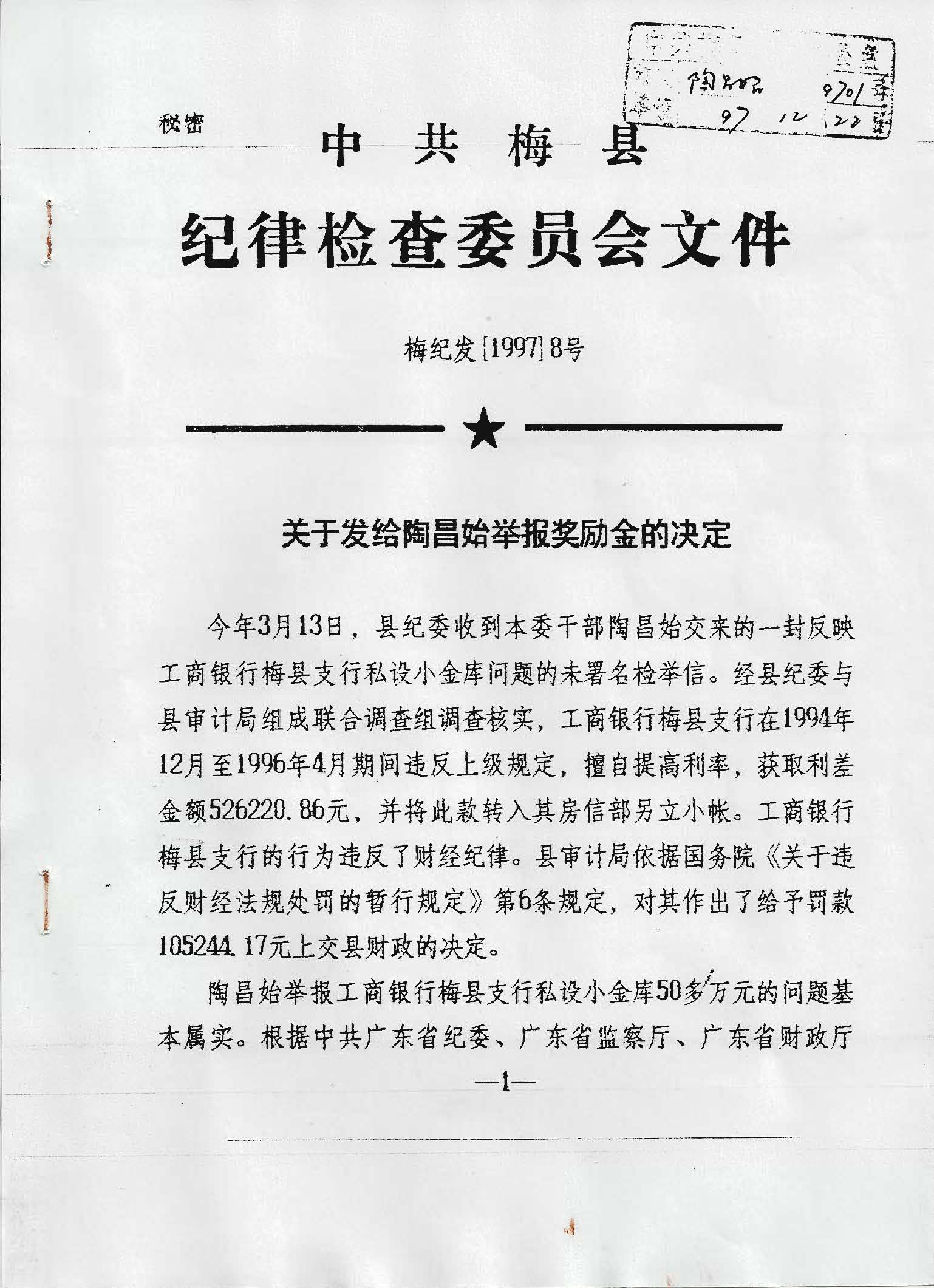 梅县发展和改革局原纪检组长、受害人:陶昌始