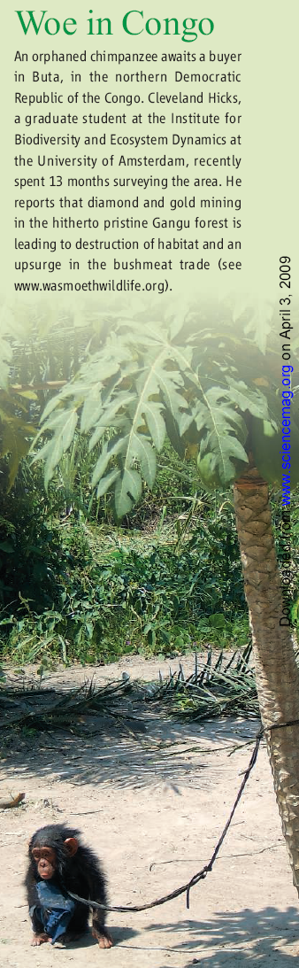 这是我在这一期的Science的Random Sample上看到的一则小新闻。非洲一带猎猩猩的行为很泛滥,猩猩的种群数量正在急剧减少。猎猩猩的其中一个主要驱动力是西方国家吃“灵长类肉”(primate meat)的潮流。除了这一则Random Sample外,NewScientist.com上也恰好做了一篇刚果一带捕猎猩猩行为的研究报道,网页上的图片触目惊心。