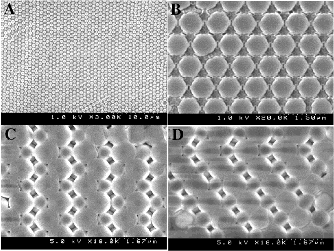 选择了JACS上的一篇文章(J. Am. Chem. Soc. 2003, 125, 15589-15598. DOI: 10.1021/ja0379969)作为代表,并邀请了作者进行访谈。这篇文章介绍了一种制备高度规整和胶体晶体膜(Colloidal Crystal Films)的方法,以下是它的Supporting Information里的部分图片(点击看大图):