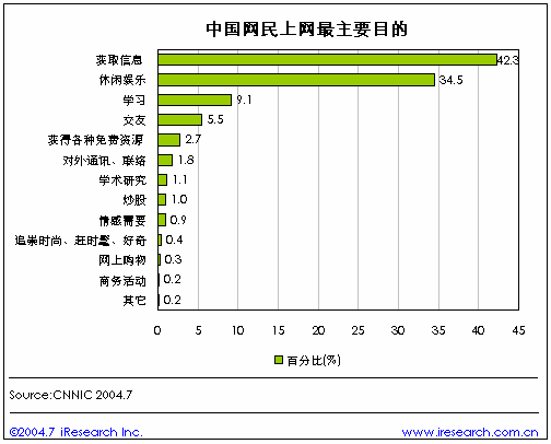 进入网吧上网比例较高农村网民在网吧上网的比例已经接近半数(48.5%)。即 5262万农村网民中,网吧网民已经达到2552万人,网吧是农村网民上网的重要途径,以收入不高的男性网民为主。但网吧违规经营及农村中小学生网民出入网吧的情况仍比较严重。农村未成年网民出入网吧的比例高达 45.4%,这一现象要比城镇普遍的多,同期城镇未成年人在网吧上网的比例仅有26.1%。农村这些未成年网民中,87.6%都是学生。,娱乐化倾向更为明显。目前农村网民平均每周上网12.3小时,比城镇网民少了5.6小时,使用深度浅。在网络新闻、搜索引擎使用率方面农村网民分别为61.4%和56.6%,比城镇居民相应使用率低了15和18个百分点。同时,多数农村网民仅将互联网当成聊天工具和玩乐工具,分别有86.4%和76%的农村网民使用网络音乐和网络影视功能。