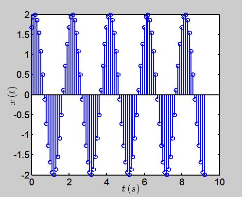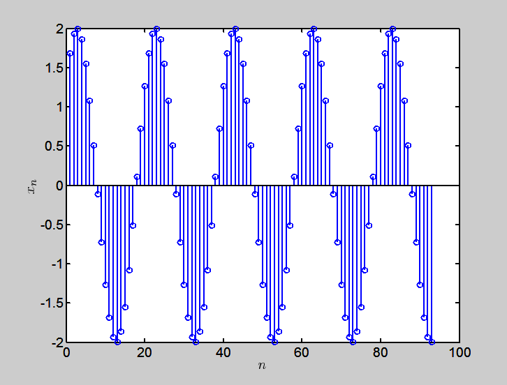 现在我们试着在MATLAB通过Fourier变换来精确地得到xn的幅值和相位,重构一个xn所对应的连续信号。首先构造上述的时域信号: