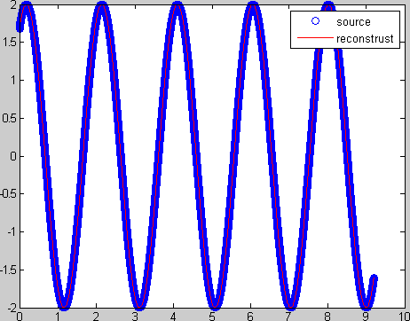 结果就比之前更接近真实值了。这说明,时域信号的采样频率越高,越有利于精确地重构。现在可以看一下重构的效果: