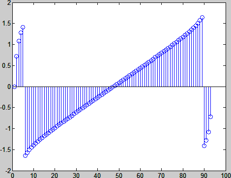 stem(angle(Xraw),'o'); % Figure 5