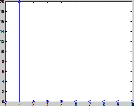 这次,频峰值终于只出现在一个频率上了。而由于用来做Fourier变换的信号N减小到了20个,所以频域信号也就只有20个单元,取左半边就是十个单元。但我们看到,峰值也变了,原来近80,现在是在20。这说明,这个不正确的峰值,是跟N值有关的。这就涉及到第三个问题:峰值怎么校正回来。其实,我们做离散Fourier变换,需要进行归一化。但是怎么归一化,要看离散Fourier变换和反Fourier变换的具体规定,不同的书规定不一样。MATLAB里fft命令是需要用N来归一化的。但如果出来双面的频谱,各边就要用N/2来归一化。所以进行了归一化的的Fourier变换操作应为: