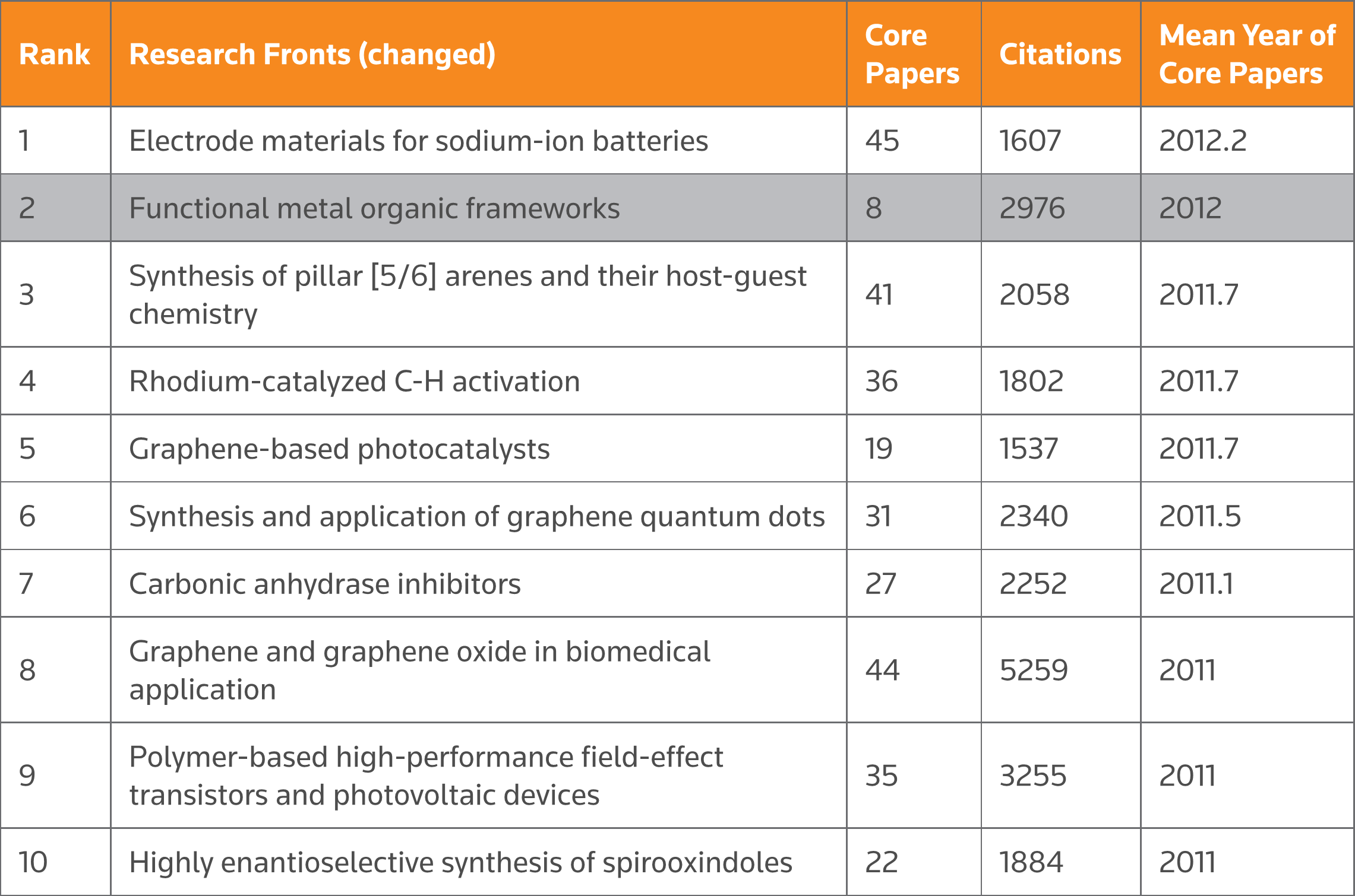 化学与材料科学领域还有14个Emerging Research Fronts,是十个领域中Emerging Research Fronts最多的领域: