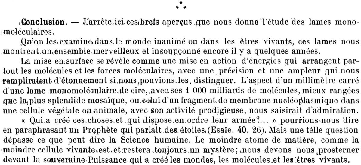原文:Qu’on les examine dans le monde inanimé ou dans les êtres vivants, ces lames nous montrent un ensemble merveilleux et insoupçonné encore il y a quelques années. La mise en surface se révèle comme une mise en action d’énergies qui arrangent partout les molécules et les forces moléculaires, avec une précision et une ampleur qui nous rempliraient d’étonnement si nous pouvions les distinguer. L’aspect d’un millimètre carré d’une lame monomoléculaire de cire, avec ses 1 000 milliards de molécules, mieux rangées que la plus splendide mosaïque, ou celui d’un fragment de membrane nucléoplasmique dans une cellule végétale ou animale, avec son activité prodigieuse, nous saisirait d’admiration.