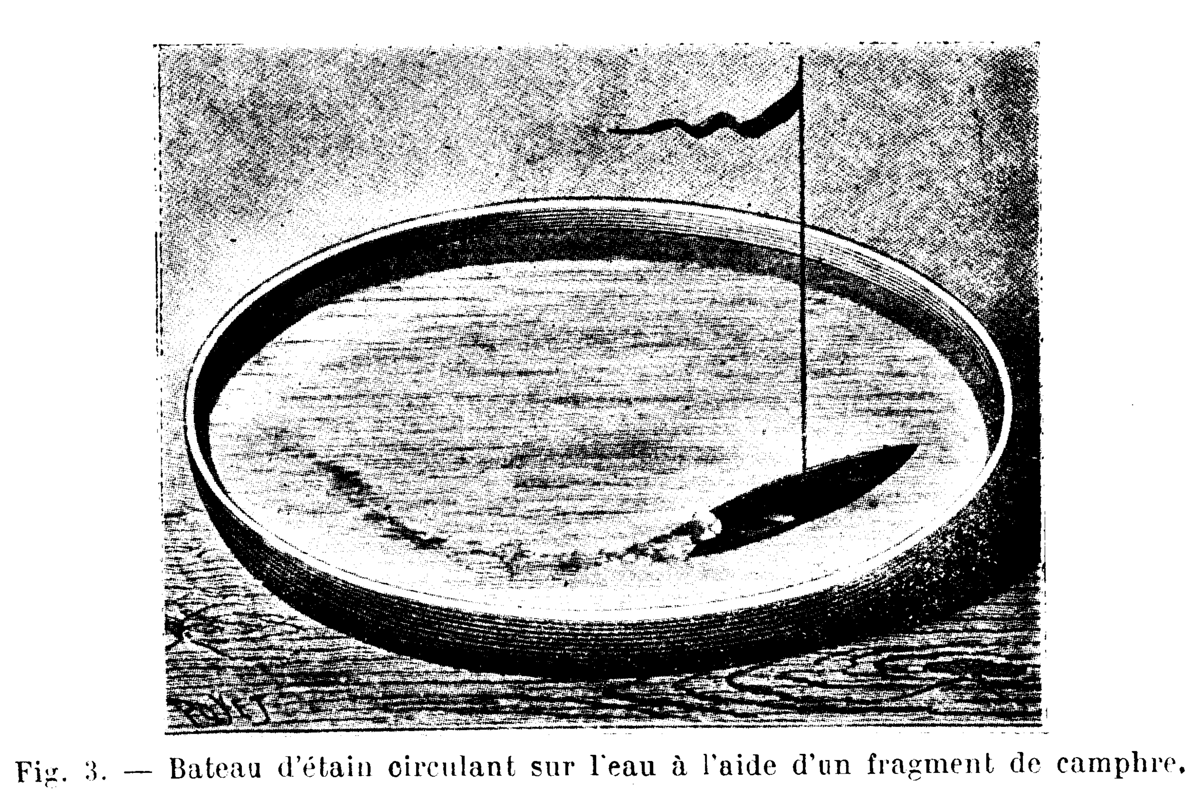 Devaux的论文[1]中展示的一个小实验:小船尾部粘了一小块樟脑,推动小船在水面上游行。1890年,瑞利利用这一现象估算了分子直径[3]。瑞利在水上滴油,直至小船不再运动,并视此刻为油分子完整铺满水面。根据所滴加的油体积与水面面积,瑞利估计了分子的直径约为1.63 nm。这种实验方法在后来的20多年里没有大的改变,被包括Devaux在内的后续研究者重复。