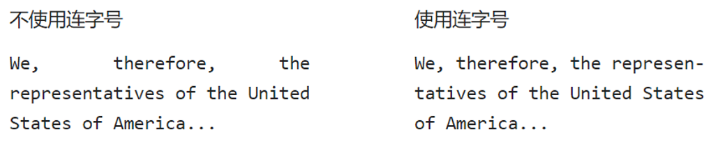 连字号(既连字号暨减号)用于在自动换行时断开行末长词。这在行宽词数较少,又想要保持两端对齐的时候可以起到帮助。