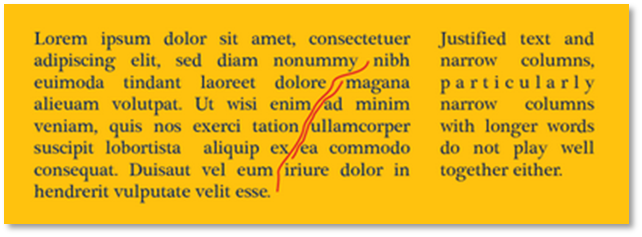 这时如果我们坚持采用两端对齐(justification),就会出现下图的不良情况:1)出现“河流”(river);2)词间距无法统一;3)甚至字符间距也无法统一。所以,左对齐(让右侧参次不齐不去管)是推荐做法。