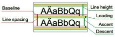 我们更经常要求调节的是“行距”。这个概念也是笼统的。严格意义上,类似“行距”意义的,有好几个概念,如下图所示。在Word当中的“行距”设置,调节的是下图中的line space。而在Windows系统下的Word软件,调用不同字体时,可能由于字体的内部设计,“行高”(下图的line height)会有冗余空白(既远超ascent、descent的多余行高),叠加到Word的行距设置上,使得行距设置值相同,但采用了不同字体时,印刷效果上的实际行距不同。给你带来这种困扰的字体应该永久性拉黑。
