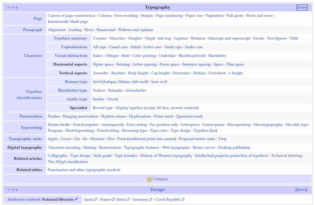 排版本身包括的知识很庞杂。下图是维基百科上typography词条下的术语表,除了体现了排版知识的庞杂之外,倒是也按照按照对象的空间尺度分了类——这也是我们入手任何排版任务时应该考虑的顺序:页面设置、段落、字符和标点符号。