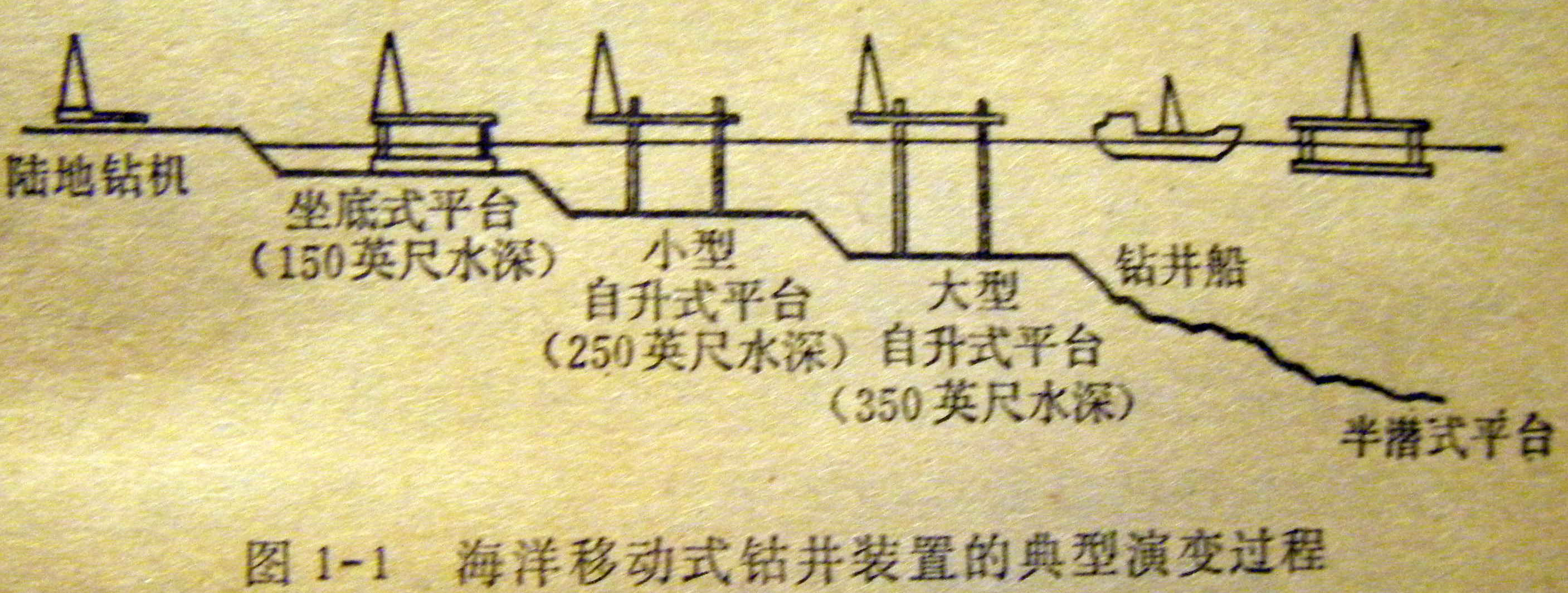 移动式的海洋平台(就是不是固定在海床上,能像船那样跑的),有一个发展历程。上图是来自由美国工程技术协会海洋培训公司编写,我国翻译出版的《海洋钻井和采油工艺》一书(83年的书了)。可见,发展的方向是往越来越深的海——也就是离海岸越来越远的地方——推进。这次墨西哥湾出事的Deepwater Horizon号,就是最后一型的“半潜式平台”,最初壳牌公司发明的(Wikipedia词条)。
