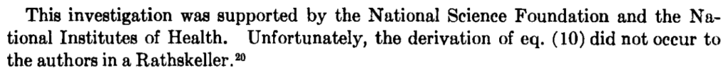 在求高分子在溶液中的无扰尺寸这件事中,有一个流行一时的方法叫Burchard–Stockmayer–Fixman作图法。这个联名主要引自两篇论文:Burchard的论文、Stockmayer和Fixman的论文。上图是Stockmayer和Fixman论文的鸣谢。为什么在感谢完国家自然科学基金的资助后,需要再表示公式(10)不是在一家德国酒吧(a Rathskeller)里推出来的呢?