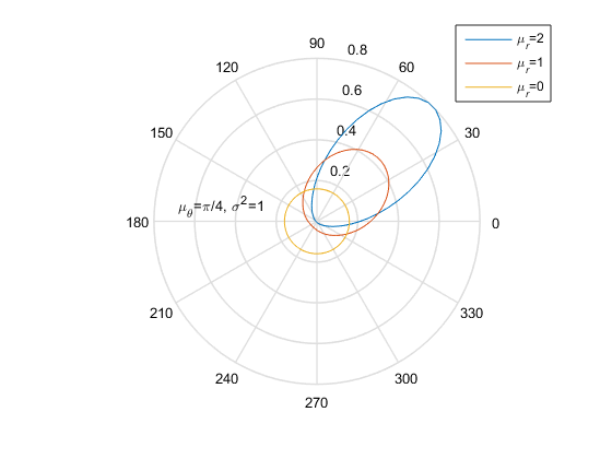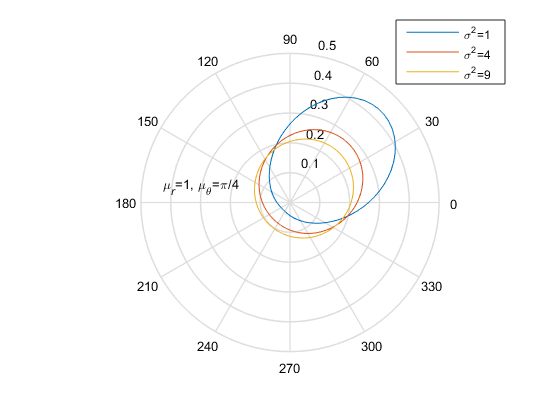 最后,看一下固定$\mu_r=1$和$\mu_\theta=\frac{\pi}{4}$,$\sigma^2=1,4,9$的结果: