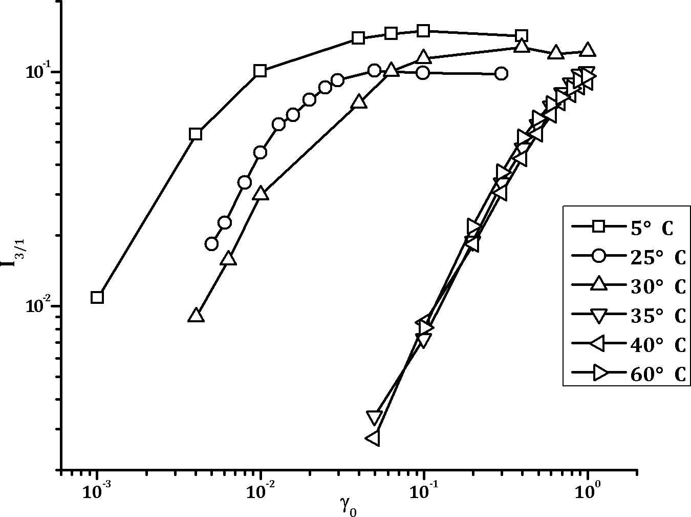 做的是多糖/蛋白体系热致凝胶化,倒是使用了一下LAOS,做了凝胶化过程的I3/1 vs γ0图,结果是凝胶化点前后,曲线按形状可明显分为两堆(见下图),凝胶化之前的体系非线性粘弹性比凝胶化之后大得多。我相信这些结果也是反映的也是网络已被破坏后结果,对凝胶网络的形成过程没有什么参考作用。