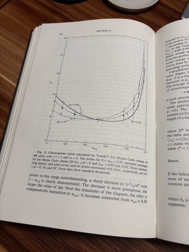 从今天的角度看,高分子物理理论的发展与液体物理的发展若不能说是同时的,则前者甚至超前于后者。因此,成功的高分子物理学家,免不了要在液体物理问题上有先锋式的正确认识。这在Flory的Principles in Polymer Chemistry一书中是有所体现的。例如在溶液热力学的格子统计部分,Flory“啰嗦”了一段话(p. 497 sec. 1a的第2自然段),实际上道出了液体的径向分布函数概念!反之,Volkenstein的原书,反映了前苏联科学家在Валентин Алексеевич Каргин(V. A. Kargin)关于液态的落后认识的影响。在Kargin当领导的期间,这些观点是用来对抗来自美国同行的不同观点的。Илья́ Миха́йлович Ли́фшиц(I. M. Lifshitz)的更加正确的高分子物理观点(1968年)被推迟到斯大林时代之后才为人所知[1]。因此,今天再想了解这部分内容,应该直接看Flory的著作。Flory的著作包括了他本人和后期的几个同事和学生:J. Mark、A. Abe、R. Jernigan、A. Tonelli的后续工作;他们发表了同一物理量的理论计算和实验测量结果比较,十分完美的印证了Volkenstein链统计理论的成功,比如以下著名插图。