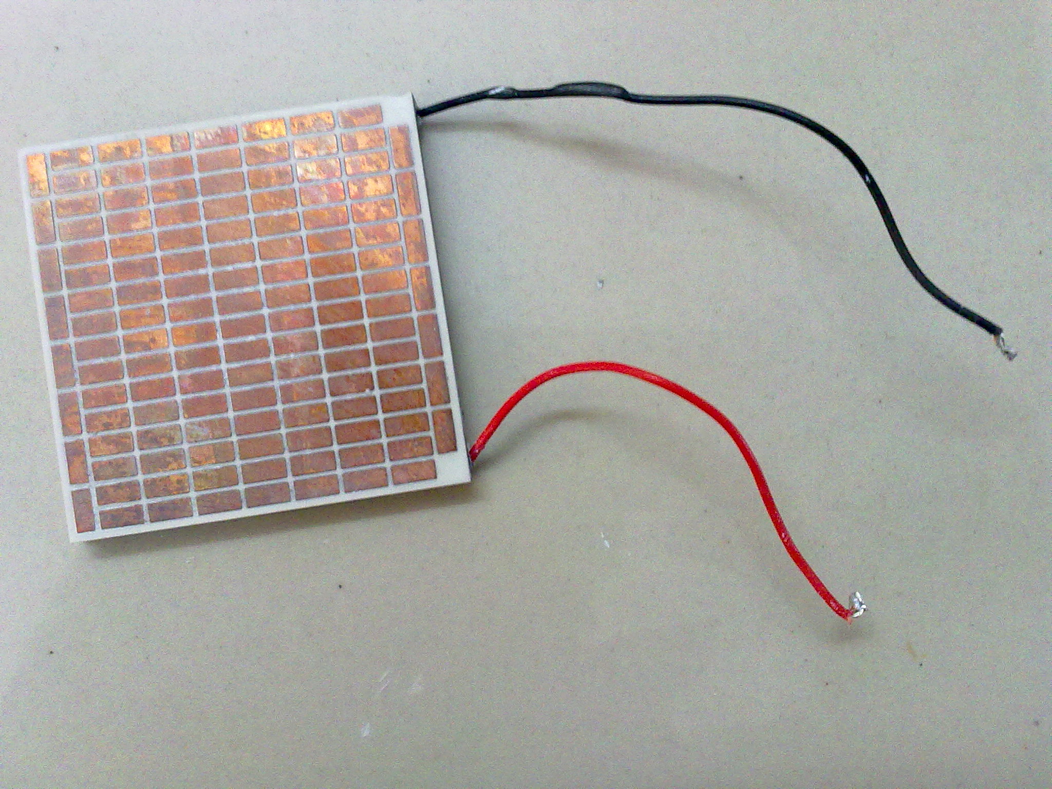首先怀疑供电电压有问题。开机用万用表量了一下,供电为直流±15.3V,正常。因此就只能判断是Peltier片坏了。以下是卸下来之后的Peltier片。最近要了解一下市面上Peltier的品牌和规格,尽快找个合适的换上。